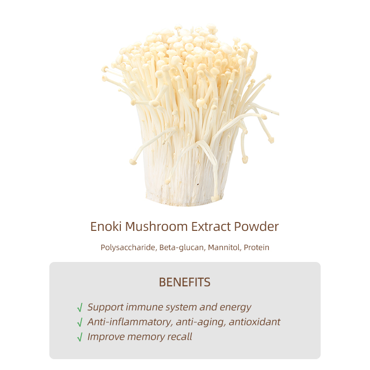 •免疫 -サポートプロパティ: 当社のエノキ茸抽出物に含まれる生理活性化合物、特に多糖類には免疫調節効果があることが示されています。これらはマクロファージやナチュラルキラー細胞などの免疫細胞の活動を刺激し、感染症や病気に対する身体の防御を強化します。当社の抽出物を定期的に摂取すると、より強力で回復力のある免疫システムに貢献する可能性があります。